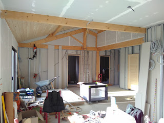 La maison prend vraiment forme et nous sommes plutôt content du résultat! Il reste encore beaucoup de travail mais les pièces seront bientôt toutes fermées. Après les moments de découragement à l'étape précédente (électricité et autres, avec beaucoup d'heures de travail mais peu de résultat visible) ça fait du bien de voir les travaux avancer!!!
